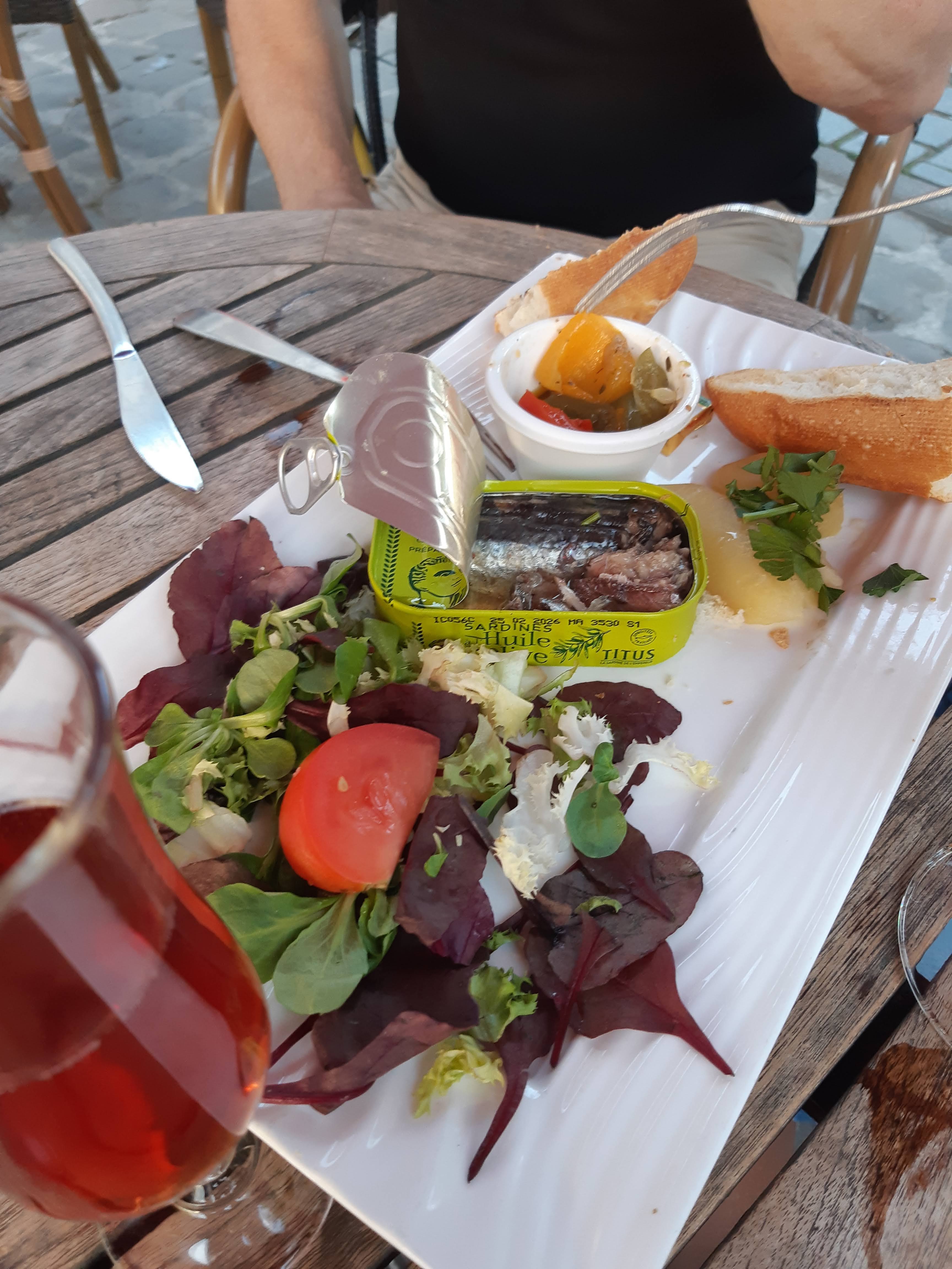 Per acompanyar les begudes ens demanem una taula de "saucisson", i per 5,50€ ens porten la fusta de llonganissa i un cistell de pa amb tres porcions de mantega... no està gens malament!